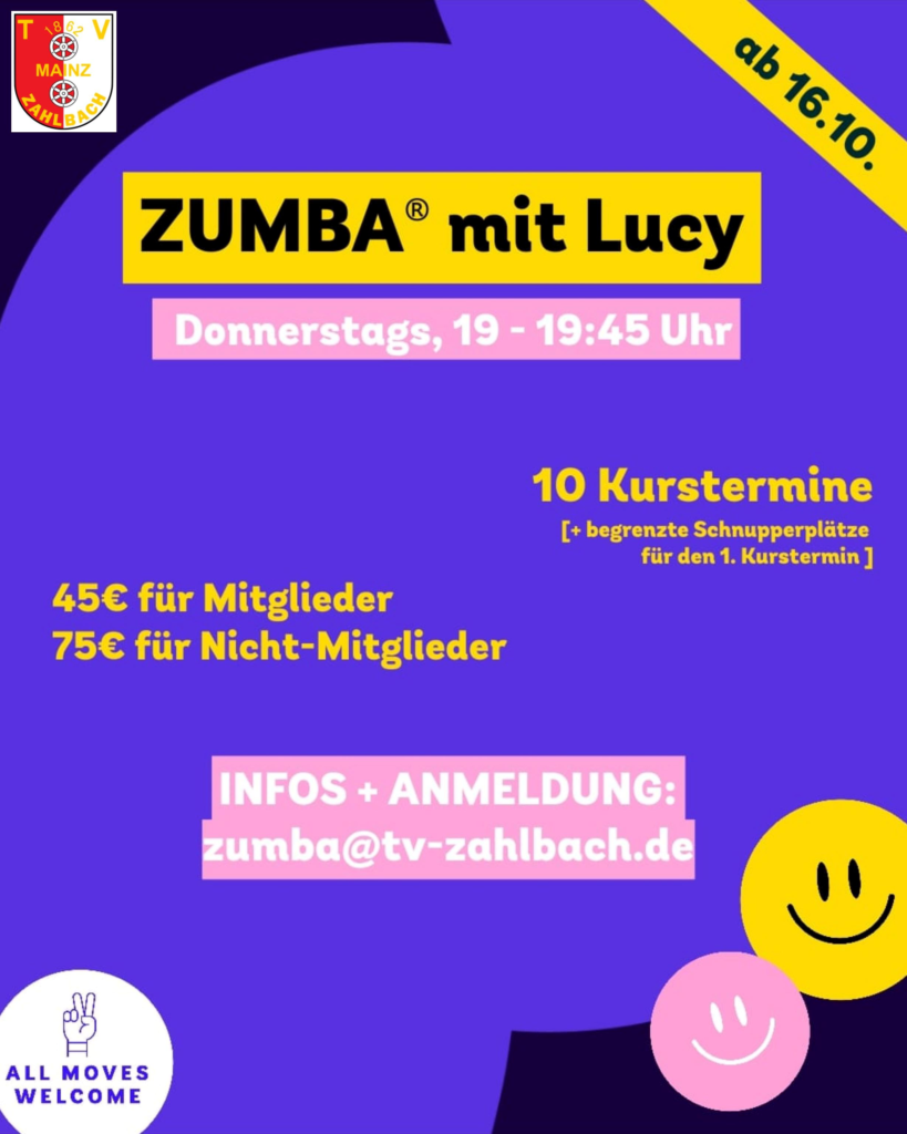 Haben wir Dein Interesse geweckt? Melde Dich jetzt unter zumba@tv-zahlbach.de an!
