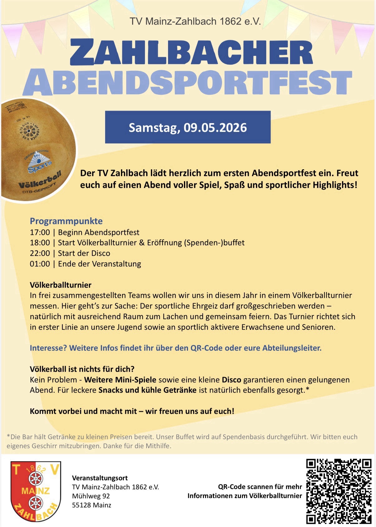 Liebe Freunde des Vereins, unser alljährliches Sommerfest wird sich erstmals „aufteilen“. Wir haben daraus ein Konzept für zwei Veranstaltungen gemacht, um das Erlebnis für alle Zielgruppen noch besser und schöner zu gestalten. Den Auftakt macht am 9. Mai unser Abendsportfest. Alle Infos entnehmt ihr dem Flyer unten.